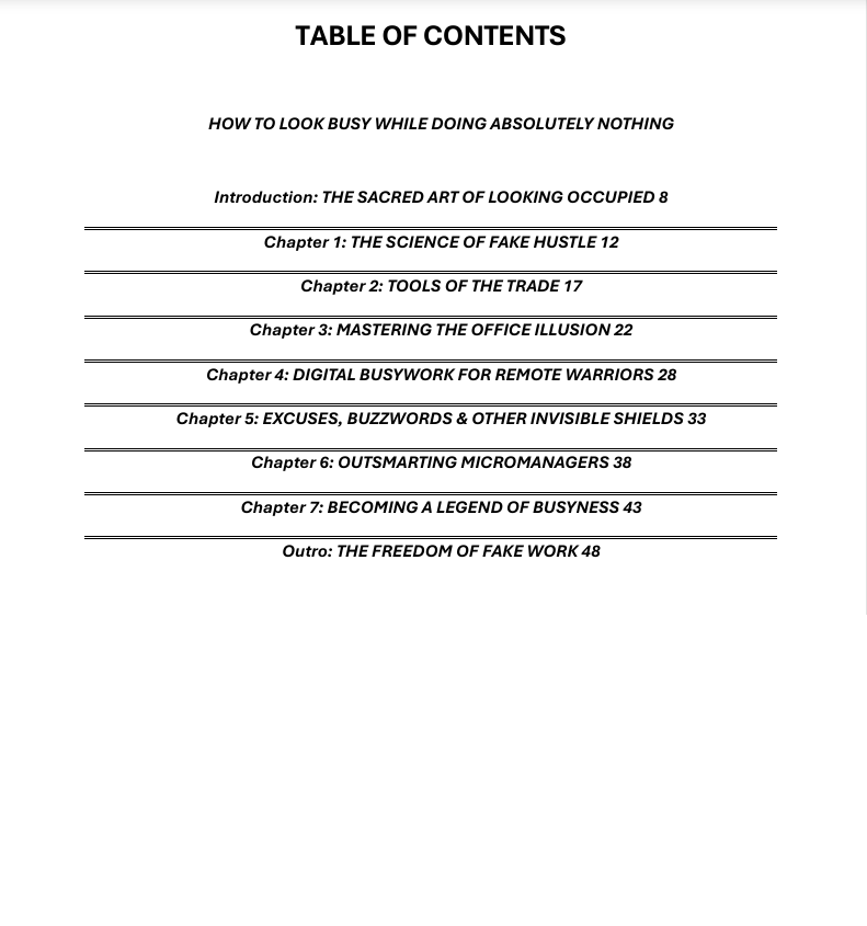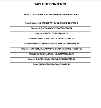 Packed with wit, fake frameworks, and painfully accurate office satire, this book is the ultimate survival guide for anyone who wants to master the optics of productivity without breaking a sweat.